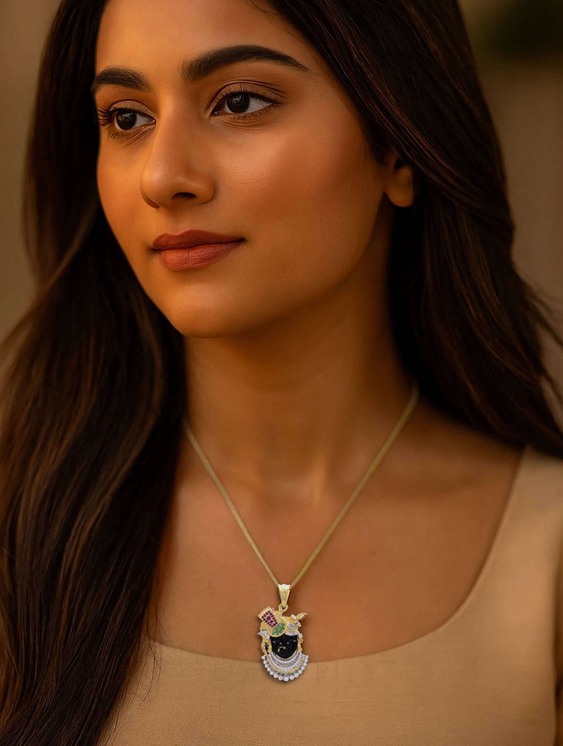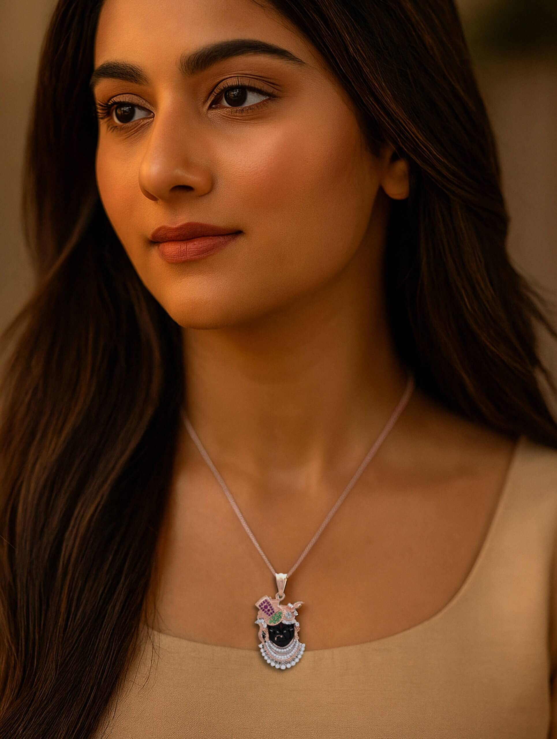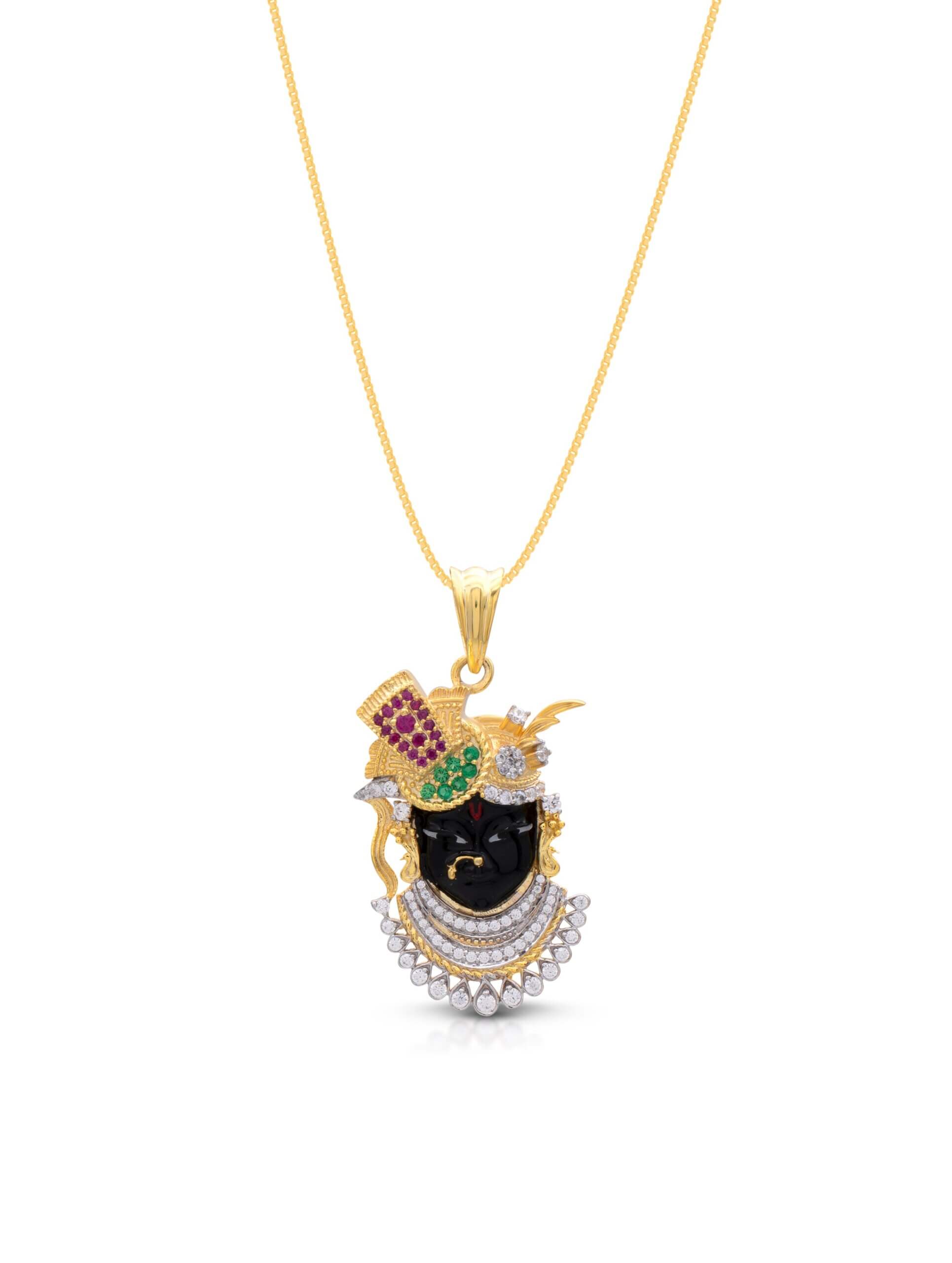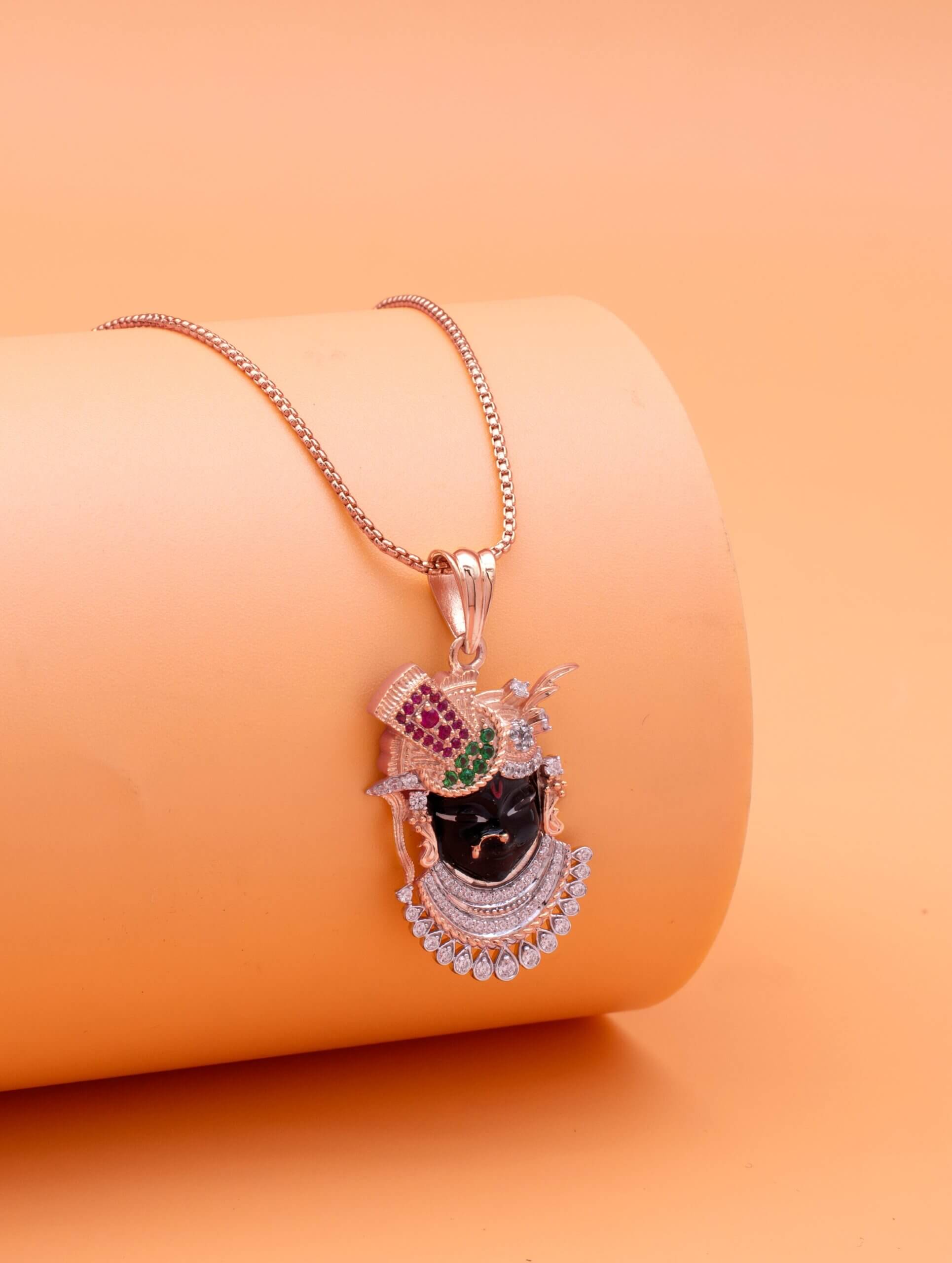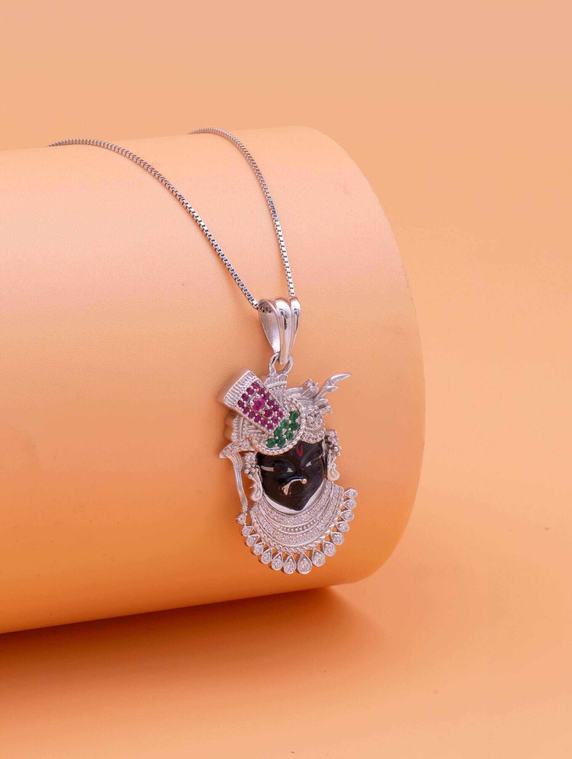 This elegant pendant necklace captures the divine essence of Indian spirituality through exquisite craftsmanship. The pendant features inspired by Shrinathji or Lord Krishna—rendered in glossy black with a richly detailed silver-tone crown. Studded with vibrant green and magenta stones and surrounded by brilliant white crystals, the design blends devotion with sophistication.