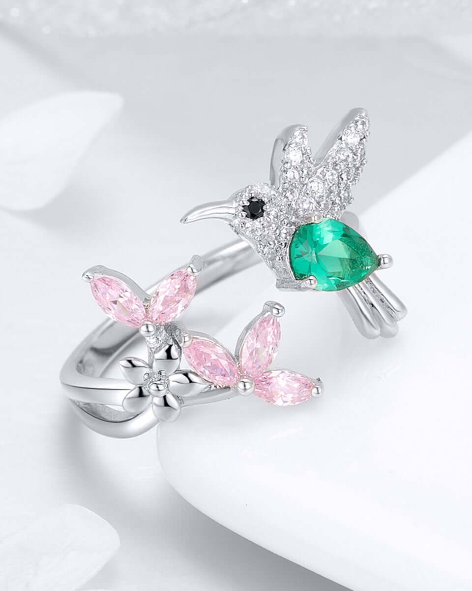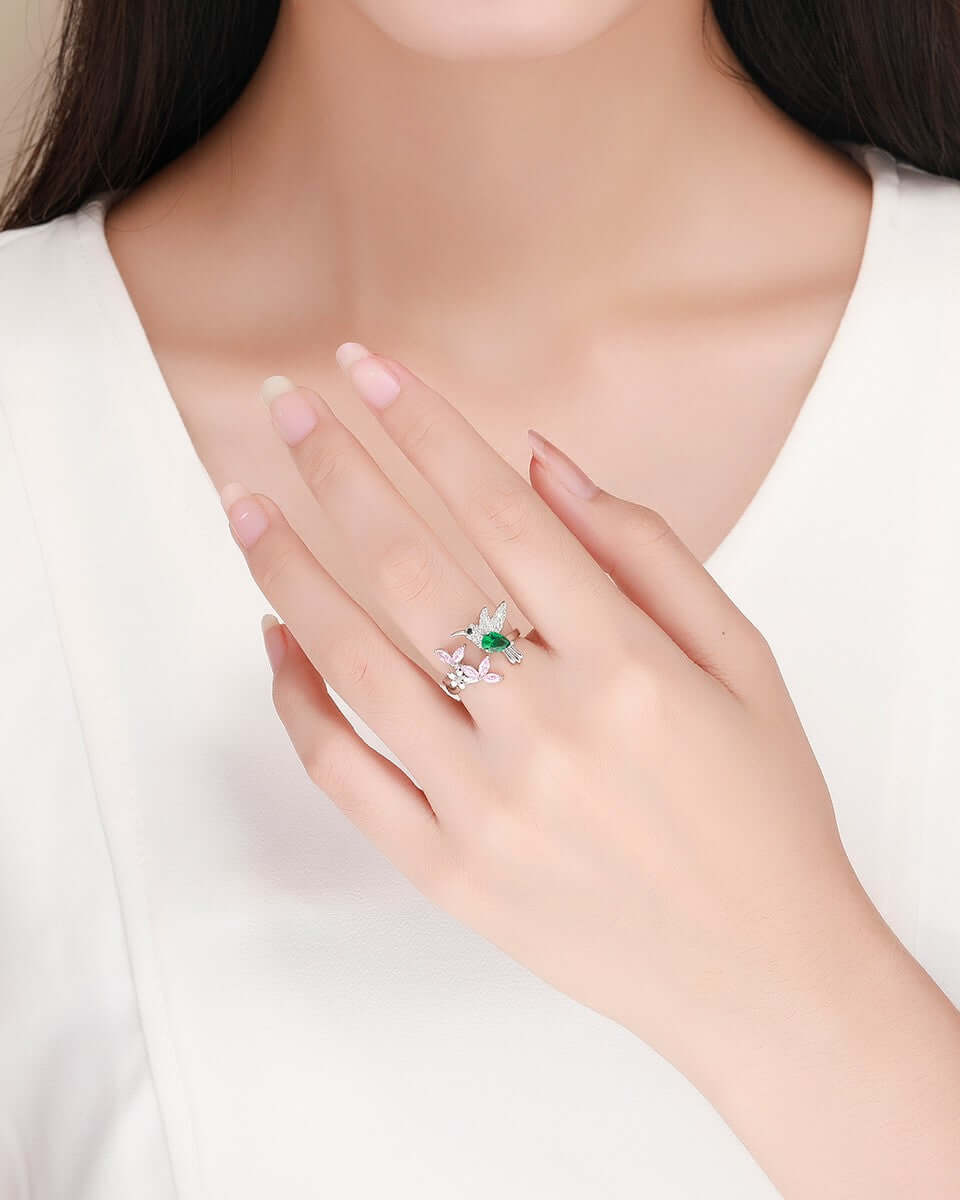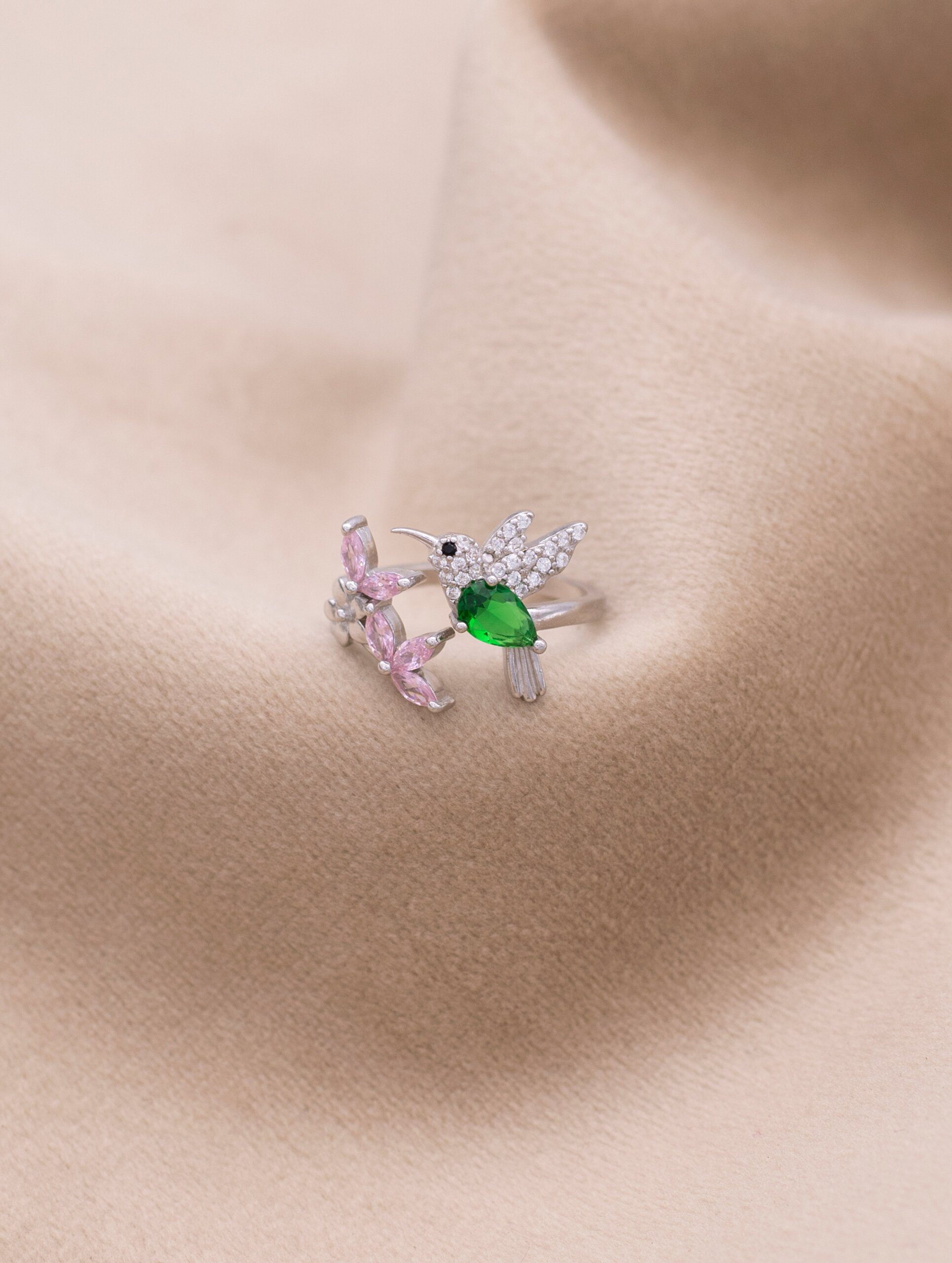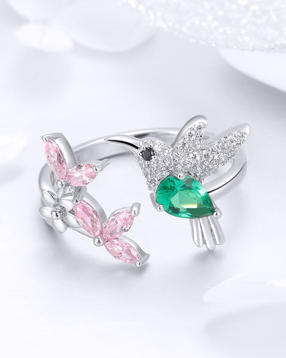Light weight ring with sterling silver finish with a bird and half flower shape with center opening, giving the ring a unique craftsmanship and style.