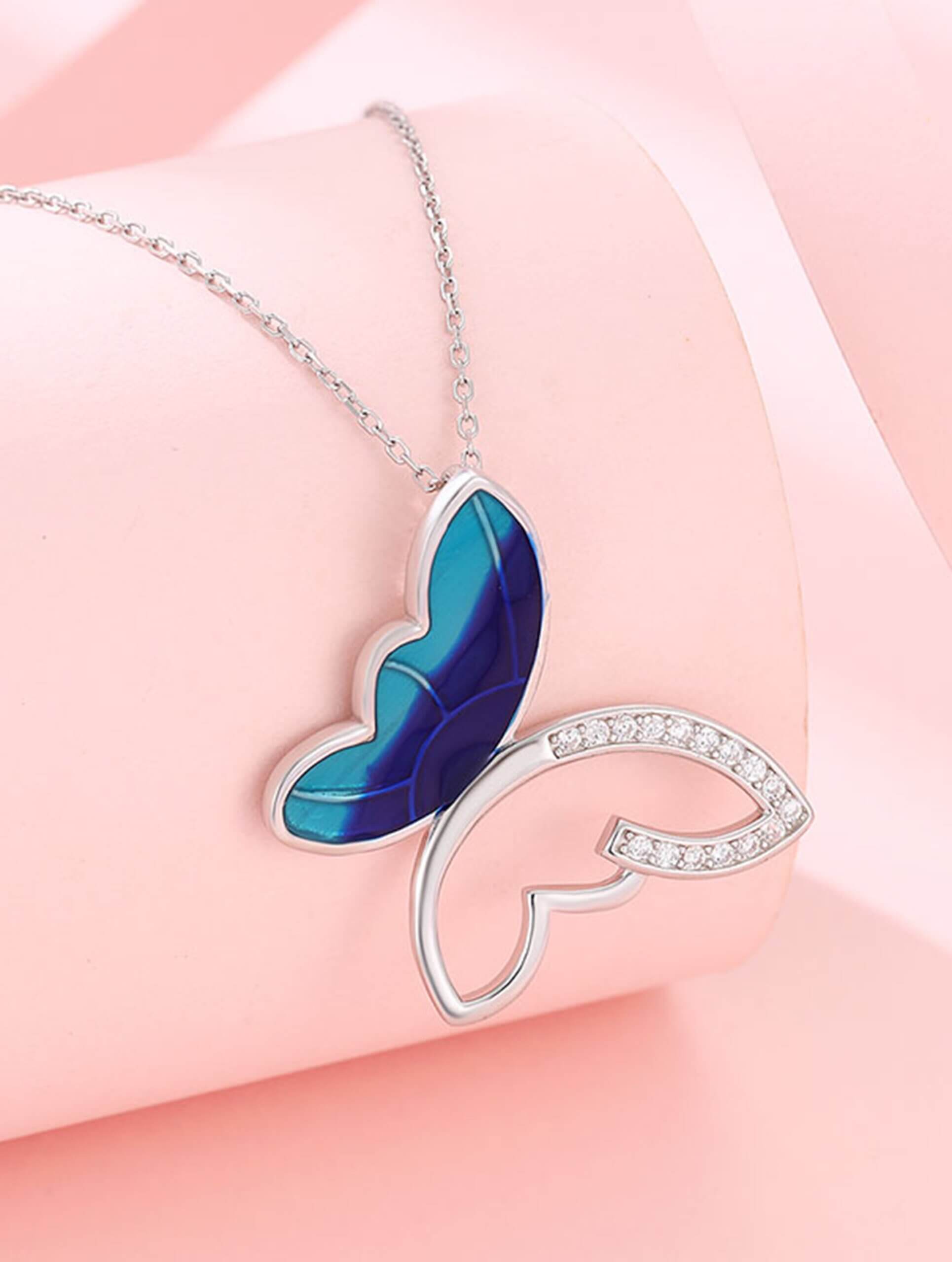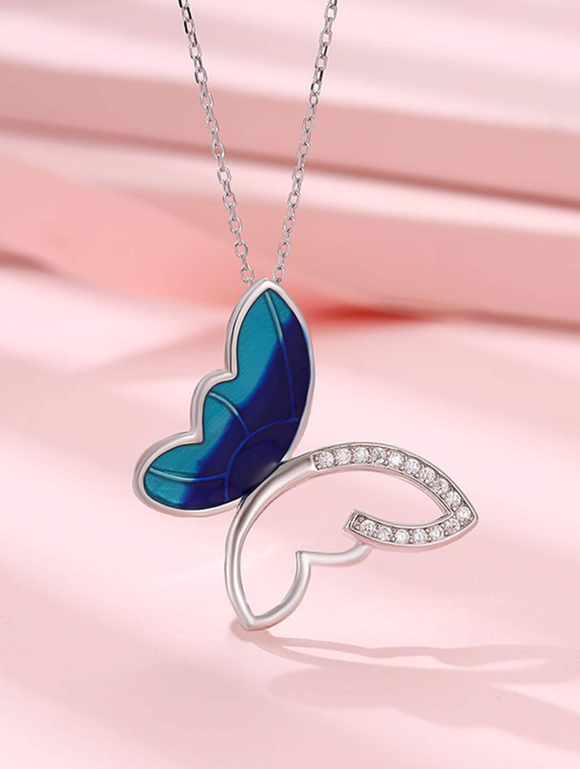 A delicate silver chain adorned with a beautifully crafted enamel butterfly pendant, symbolizing grace and transformation. Perfect for adding a touch of elegance to any outfit, this timeless piece combines artistry and sophistication effortlessly.